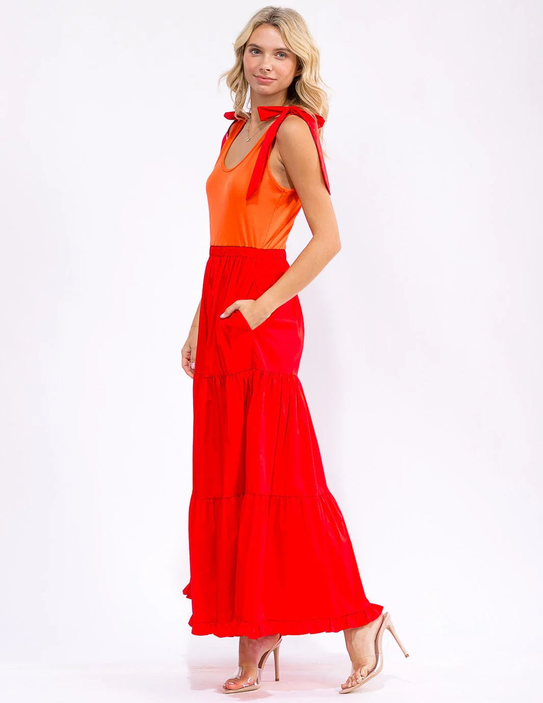 FRONT POCKET TIERED COLORBLOCK MAXI DRESS