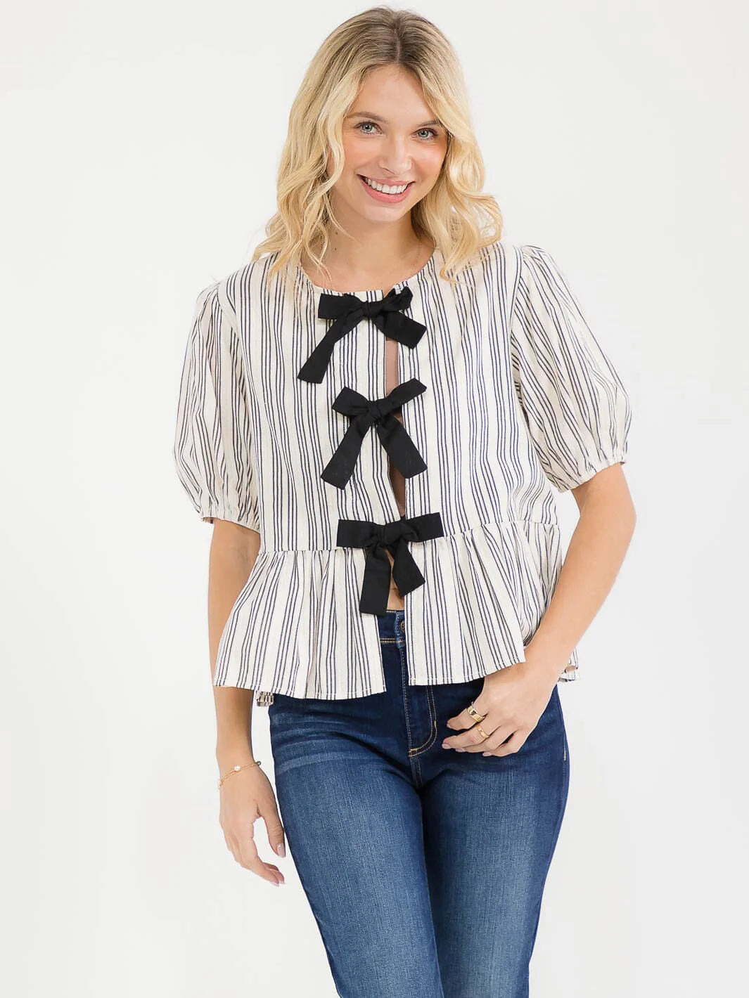 FRONT TIE STRIPES COLORBLOCK PEPLUM TOP