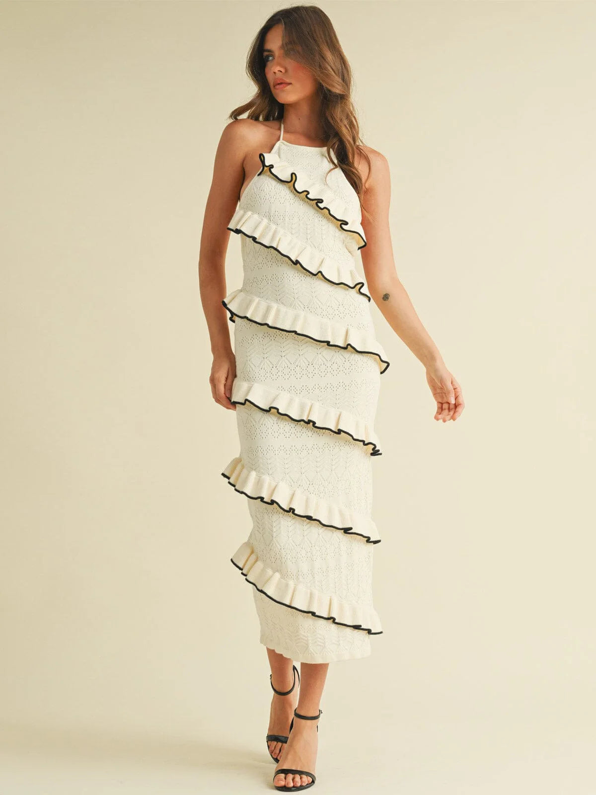 HALTER NECK OPEN BACK TIERED RUFFLE BODYCON MAXI DRESS